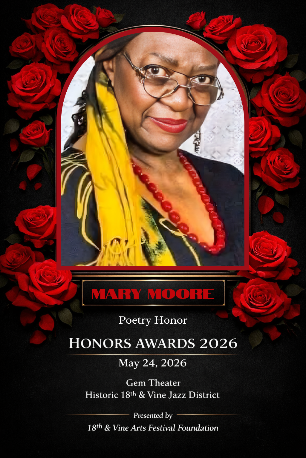 The 18th & Vine Arts Festival Foundation is proud to honor Mary Moore, affectionately known as “Mother Mary,” as the 2026 Poetry Honoree — recognizing a lifetime of artistry, activism, storytelling, and cultural leadership.